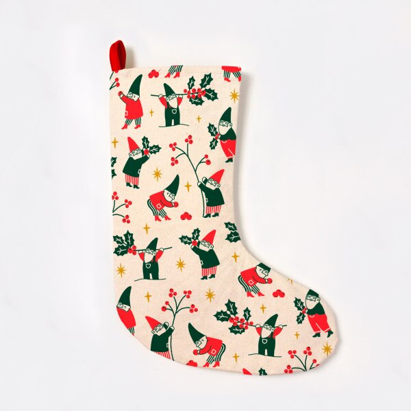 Stock up for the holidays like these cute berry-picking gnomes! As a Christmas stocking or winter holiday decoration, hang this on the mantle and fill it with gifts! It’s also a great way to wrap a present, as a gift bag. Silkscreened on a lightweight cotton canvas, this stocking has a contrasting cotton twill loop for hanging. Made in India.
