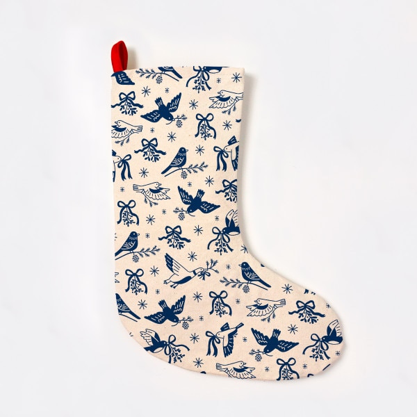 Soar into the holidays with our Winter Birds stocking! As a Christmas stocking or winter holiday decoration, hang this on the mantle and fill it with gifts! It’s also a great way to wrap a present, as a gift bag. Silkscreened on a lightweight cotton canvas, this stocking has a contrasting cotton twill loop for hanging. Made in India.